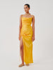 Rich modal satin bodycon dress sculpted to contour and flatter. Draped cowl neckline brings a soft, romantic edge. Adjustable drawstring slit for customizable movement and allure. Slim adjustable straps, side zip closure, and voile lining for comfort and ease.