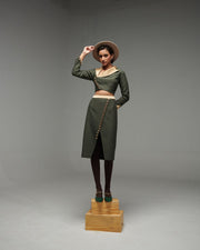 SKIRT: Calf Length Wrap Skirt with Gold Waistband. Gold Buttons are Given along the Wrap Panel. Invisible Side Zipper and Hook-Bar given for opening and closure.