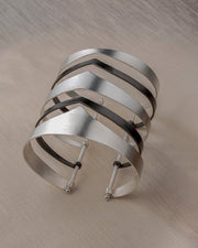 This design pays homage to the fierce women warriors of ancient India through a captivating 5 bangle handcuff. Each bangle embodies the sharp silhouettes of ancient Indian architecture, symbolizing the unwavering strength, resilience, and deep-rooted connections that resonate with the modern women of today. Adorning this hand cuff, women embrace their heritage while exuding a timeless grace, embodying the powerful legacies of their warrior ancestors.
