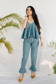 Kala cotton, dyed with azo-free dyes. Spaghetti strap V neck Flared top. Bottoms with small pleats and a drawstring hem for flare.