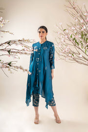 Top - Button front, full sleeve, flared cut, with asymmetric hem embroidered long top giving the illusion of a tunic. A crop asymmetric embroidered back gives an overcoat look.