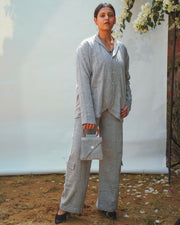 Crafted in 100% cotton fibres and natural materials. The Sonder Unisex Rounded Hem Jacket comes in an interesting twill weave of black and white and has been naturally dyed using Myrobalan and Iron.