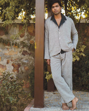This co-ord set is characterized by its sheer simplicity and yarn-dyed diagonal lines, which are created by an offset in the warp threads.