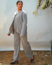 This co-ord set is characterized by its sheer simplicity and yarn-dyed diagonal lines, which are created by an offset in the warp threads.