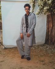 The overlay comes with double pockets, loops at the shoulder to style a scarf, a detachable waist belt, and adjustable belts at the sleeve hem. The adjustable sleeve belt, adorned with stitches of Kantha, a form of Indian hand embroidery involves the wearer in the process of choice and interchangeability.