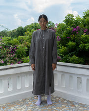 A long dramatic button-down dress with gathers in the back and the shoulders in the front. The sleeves are long, and slightly flared with a cuff and ties on the same.