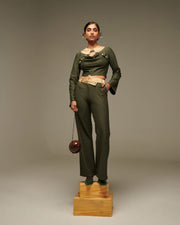 CROP BLAZER: Olive with Black Pinstripe as the main fabric and Gold Bubble Crepe for Collar detailing.