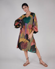 Tahera x Kate's Balloon Sleeve Dress combines the drama of Kalamkari with the flamboyance of a statement sleeve to create a truly artistic look. With a nod to the traditional kurta style, the Balloon Sleeve Dress has one side slit and can be worn layered over pants or on its own as a dress that falls just below the knee. This dress is cut for a loose fit and simply slips on.