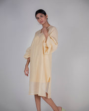 Tahera x Kate's Balloon Sleeve Dress brings a further artistic element to the raw beauty of hand-loomed cotton with its dramatic, statement sleeves. With a nod to the traditional kurta style, the Balloon Sleeve Dress has one side slit and can be worn layered over pants or on its own as a dress that falls just below the knee. This dress is cut for a loose fit and simply slips on. It comes with a matching lining slip due to the sheer nature of the cotton.