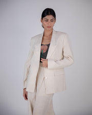 Tahera x Kate's Blazer has a relaxed shape with padded shoulders and peak lapels. It is tailored from cotton that has been embroidered and printed, giving it a rich depth that becomes more apparent the closer you get. Wear it over the Tahera x Kate Kalamkari pieces for a true visual feast or with an all black ensemble to let the jacket shine.