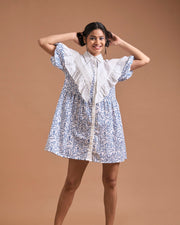 This stunning piece combines traditional craftsmanship with modern design, featuring a unique contemporary silhouette with hand-block prints. The broad collar adds a touch of sophistication, making it a must-have for any fashion-forward wardrobe. The dress features a line of buttons running from the top all the way down to the bottom, adding a functional detail to its design.