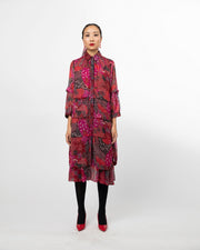 This shirt dress is cut in 100% viscose highlighting double layer, bold pleat detail, and exaggerated sleeve detail and front placket opening.