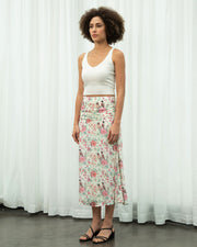 Breeze through summer in this sophisticated skirt, featuring dreamy floral and a minimalist silhouette adorned with overall love birds jaal prints. The soothing off white colour and the soft texture of satin makes this skirt a perfect for both evenings and for the hot, balmy days coming at us.
