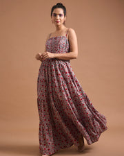Experience the allure of our meticulously crafted long dress, designed with eco-consciousness at its core. Hand block prints add drama, while the pleated upper top beautifully enhances your figure. Front and back pleats create a mesmerizing visual effect. Adorned with a side zipper, this ethereal gown offers both comfort and sophistication. The voluminous bottom adds grandeur, making every step feel like a goddess's graceful stride.