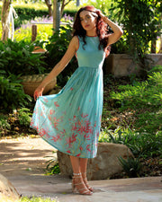 An easy-wearing, spider lily printed dress that features a round neck, gathers, and a little pop of detail with neck and armhole binding in contrasting colour. This teal-hued summer dress will help you keep cool in style with their flowy fits and lightweight fabric that lends a dreamy flourish to your everyday routine.