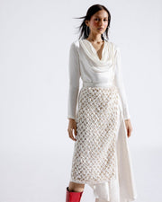 Our Cream Coccon Wrap Smocked Skirt features a unique tie-up design that ensures perfect fit. With its chic asymmetry, it's the perfect choice for a stylish, modern look that can easily transition from day to night. Crafted with meticulous attention to detail, the Off-White Overlap showcases intricate hand embroidered smocking making it as unique as it is timeless.