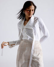 Our Crisp Ivory Shirt is made in white cotton poplin with a flap collar, a must-have stylish to your wardrobe. This poplin shirt features a unique flap collar design with extended straps that add a twist to the classic white shirt. Whether you're dressing it up for formal office meetings or keeping it casual for everyday wear, our White Poplin A shirt with a Flap Collar will be your perfect companion.
