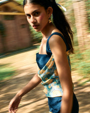 Wide strapped teal jumpsuit with tube bodice and filaree print cowl.