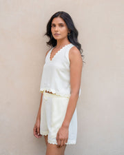 This exquisite top showcases a delicate scalloped design, adding a touch of feminine allure to your attire. The top also features a side slit with intricate knot details, allowing for easy movement and a playful twist. Experience unparalleled comfort as the soft and breathable modal fabric gently caresses your skin. Whether you're simply stepping out for the day or going out for brunch with your friends, our Ivory yellow Scalloped Top in Modal will be your go-to choice for effortless style and comfort.