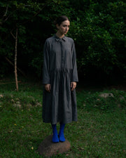 A refined dress with a concealed placket, shirt collar, and graceful gathers from the waistline. Long sleeves with an exaggerated cuff add a touch of sophistication to this smart ensemble.