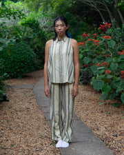 A versatile halter neck shirt with hand-painted stripes that seamlessly fits into your wardrobe.