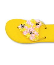 Hand-embellished by artisans on rubber flipflops collected from factories. Made in India.