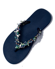 Hand-embellished by artisans on rubber flipflops collected from factories. Made in India.