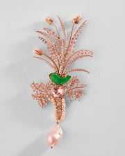 A statement for a suit lapel or pocket patch, the Le Sunset Palm Brooch in Jade Green presents an exaggerated form of the House's Royal Palm motif. Regal as it appears, the jeweled accessory is encrusted with a selection of crystals, cubic zircons, and Keshi pearls. A barouque pearl dangles from the gold-plated metal mold while highlighting the finesse of our expert craftsmen. Finished in 22Kt gold, the creation is a one-of-a-kind accessory, ready to be styled in more ways than one