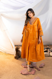 The V-neck is formed with borders inspired by Suzani designs, meticulously crafted using the rich luster of gold zari and the soft sheen of silk threads. This intricate detailing adds a touch of opulence and cultural allure to the kurta.