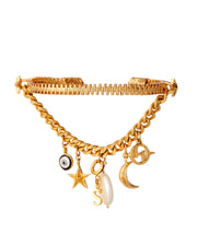 Handcrafted in a gleaming 22K gold finish, the Universe of Charms Bracelet is a medley of a luscious baroque pearl and motifs of celestial worlds. The bracelet can be personalised with your initials or a loved one’s, making it a universe, truly yours.