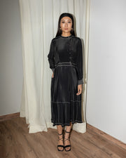 This wrap dress is cut in Viscose Crepe, with an asymmetrical placket operating with a band collar, and features a wrap silhouette with an elasticated band at the back of the waist.