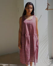 This sleeveless dress is curated from fabric woven by artisans in Jharkhand, using traditional weaving techniques on a loom, displaying intricate stripes with vibrant colors