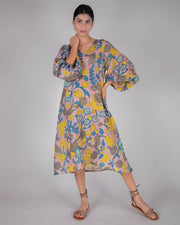 Tahera x Kate's Balloon Sleeve Dress combines the drama of Kalamkari with the flamboyance of a statement sleeve to create a truly artistic look. With a nod to the traditional kurta style, the Balloon Sleeve Dress has one side slit and can be worn layered over pants or on its own as a dress that falls just below the knee. This dress is cut for a loose fit and simply slips on.