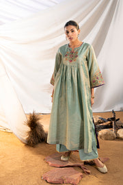 Green Handloom cotton zari tissue kurta, adorned with gathers at its center, boasts a silhouette that is both graceful and enchanting. The yoke steals the spotlight with an embroidered motif inspired by the intricate patterns of Suzani.