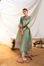 Green Handloom Cotton Zari Tissue Kurta, designed in an aligadi cut for a silhouette that combines tradition with contemporary flair. The V neckline is a focal point, intricately crafted at the intersection of scalloped borders, boasting the opulence of gold zari and the soft sheen of silk threads. Inspired by Suzani motifs, a standout feature is the beautifully patched motif on the hemline corners. The kurta is paired seamlessly with glazed cotton pants featuring a gold-embroidered border.