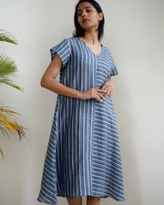 This A-line dress is curated from fabric woven by artisans in Bihar, crafted using traditional weaving techniques on a loom, displaying stripes