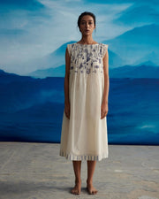 In an eye-catching print that graces the shoulders and neck, presenting our distinctive silhouette, the pleated boat neck dress exemplifies a modern take on tailoring. Delicate, small pleats enhance the dress's allure, striking a seamless equilibrium between sustainability and urban aesthetics. The addition of lace detailing on the armhole and discreetly incorporated into the slip brings a touch of enchantment to the entire ensemble.