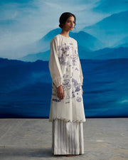 The dolman sleeve kurta, adorned with hand-screen printed motifs and lace details on Chanderi, stands out as a captivating piece that commands attention. Featuring pleats on both the front and back, this sleek and understated essential is an ideal choice for refreshing your traditional winter wardrobe. The kurta embodies an alluring grace, making it a perfect staple for the everyday goddess.