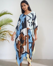 This kaftan is made by artisans in Assam, crafted using traditional weaving techniques on a loom, displaying a floral print