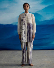 The enduring mandarin collar shirt, with hand-screen printed patterns and lace details, embodies a modern reinterpretation of the traditional long shirt. The harmonious blend of diverse textures dispels any monotony, infusing a versatile and contemporary allure into this essential wardrobe piece. Its timeless nature renders it an ideal option to enhance the charm of any casual ensemble.