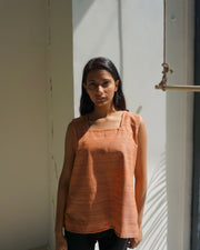 This sleeveless top is curated from fabric woven by artisans in Jharkhand, using traditional weaving techniques on a loom, displaying intricate stripes with vibrant colors