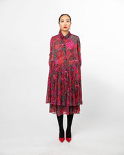 This shirt dress is cut in 100% Viscose highlighting micro-pleated frills done manually placed at the lower bodice featuring a double layer detail towards the hem.
