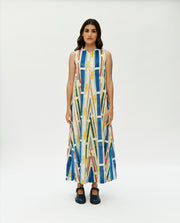 100% organic cotton handspun & hand woven. Off white base with multi colour handblock printed stripes. Side inseam pocket.