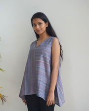 This sleeveless top is curated from fabric woven by artisans in Jharkhand, using traditional weaving techniques on a loom, displaying intricate stripes with vibrant colors