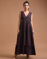 Embrace the effortless charm of our "Bohemian Ajrakh Drift Dress," a testament to the beauty of sustainable fashion. This pure cotton creation is adorned with timeless Ajrakh hand block prints, celebrating the age-old artistry. The dress features a flowing, sleeveless design with a flirtatious front split, perfect for those who love a blend of tradition and modernity. The V-neckline and ruffled hem bring a bohemian flair to your ensemble, making it a standout piece for any occasion.