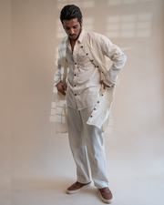 Crafted in 100% cotton fibres and natural materials. This undyed and unbleached 60s cotton overlay comes with a play of small-checked fabric. A unisex button-down silhouette that comes with patch pockets on the front and is adorned with the stitches of Kantha, a form of Indian hand embroidery along the pockets and cuff.