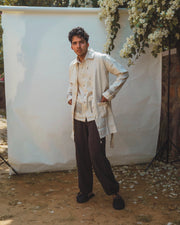 A silhouette that can be styled well in summers as well as in winters, enriched with subtle Kantha embroidery running along the collar and front placket.