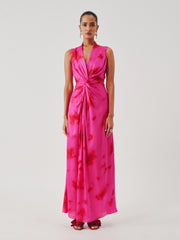 Crafted in modal satin with a body-skimming fitted silhouette. Twisted drape under the bust lends a sculptural, contemporary edge. Distorted pink and deep red tie-dye creates a bold yet refined statement. A versatile piece made for sundowners, soirées, and intimate date nights.